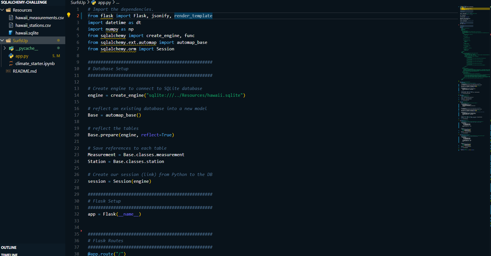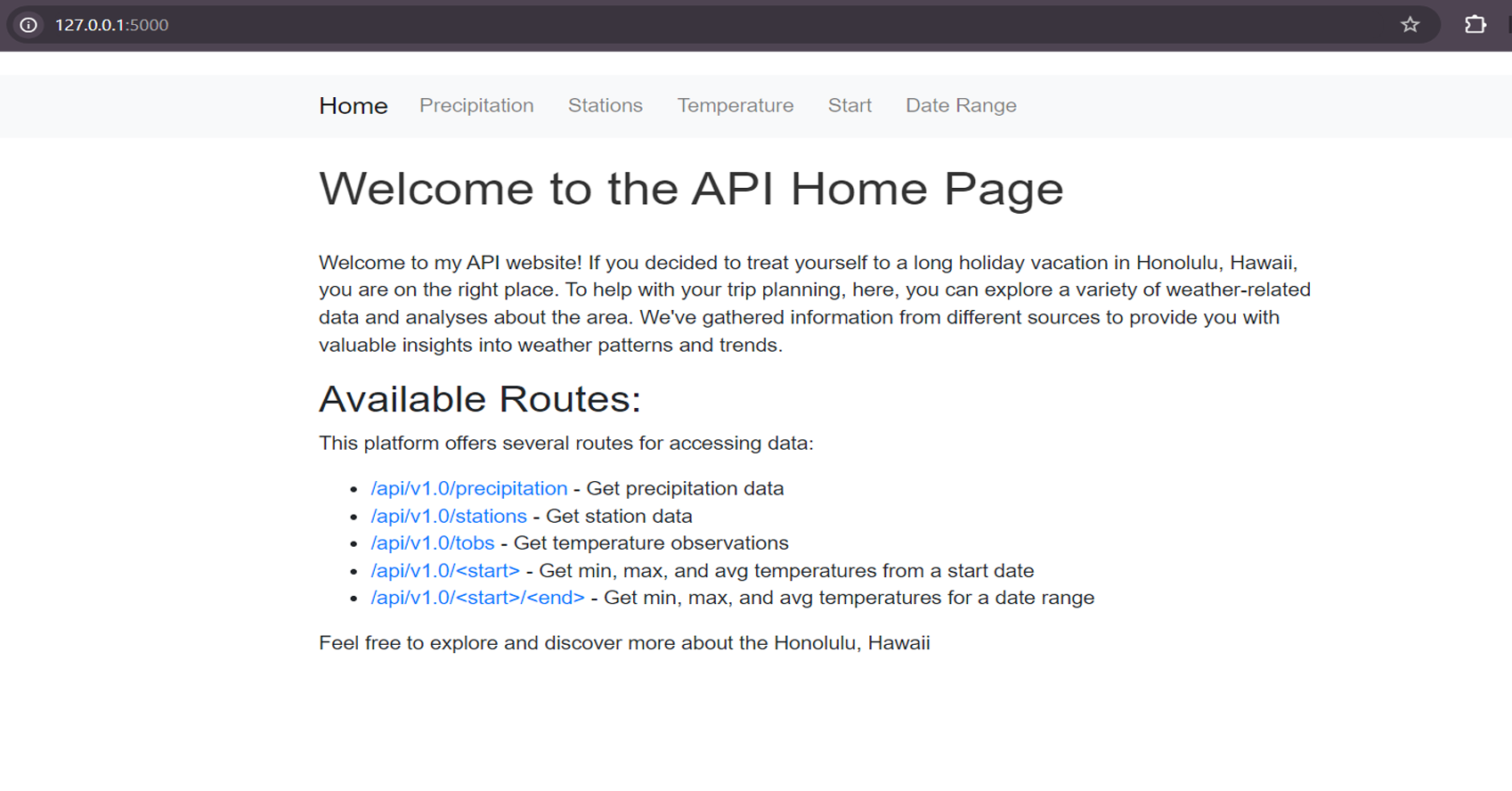 - Created routes to serve precipitation data, list of weather stations, temperature observations, and statistics (min, max, avg) for user-specified date ranges.