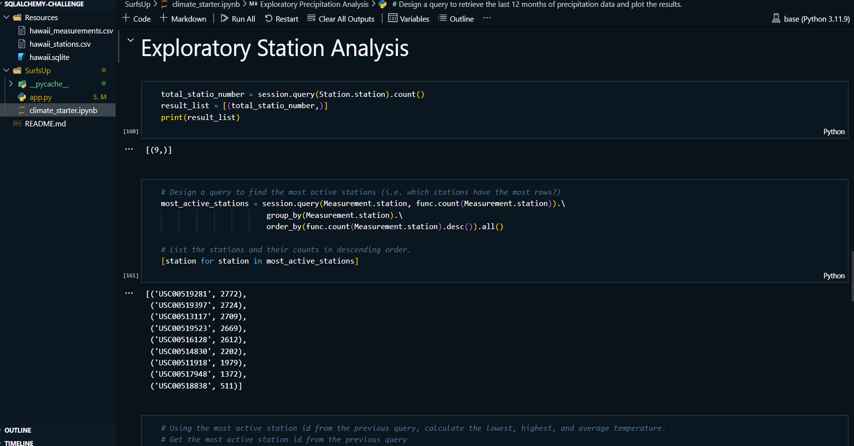 Conducted station analysis to identify the most active weather station based on observation counts.