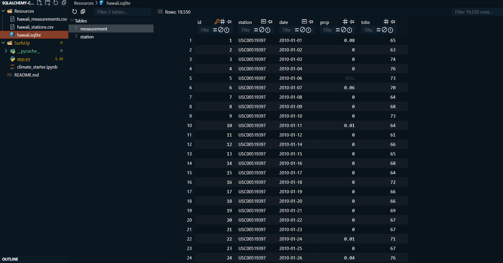 Connected to the SQLite database using SQLAlchemy and explored the tables using SQL queries.