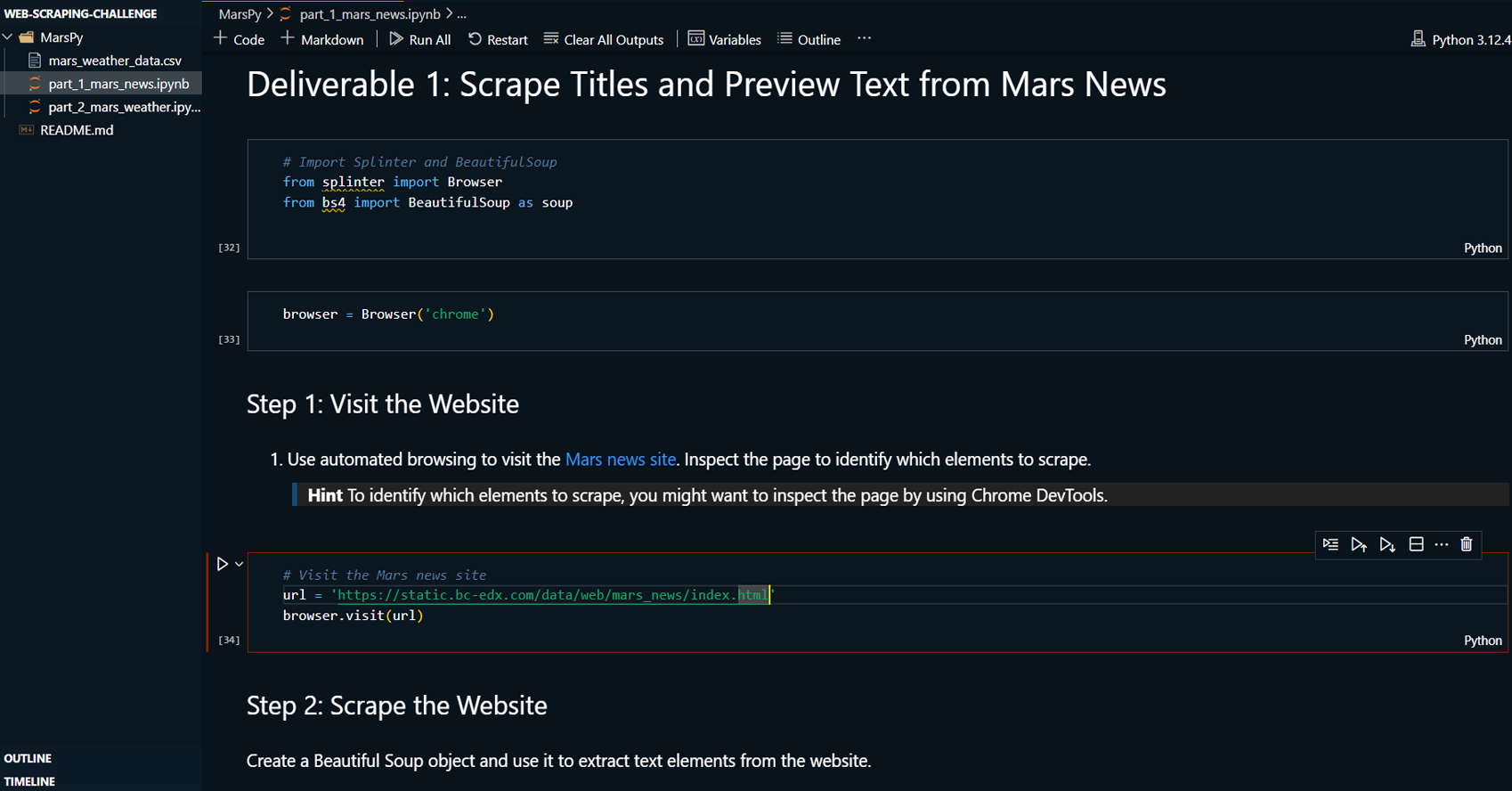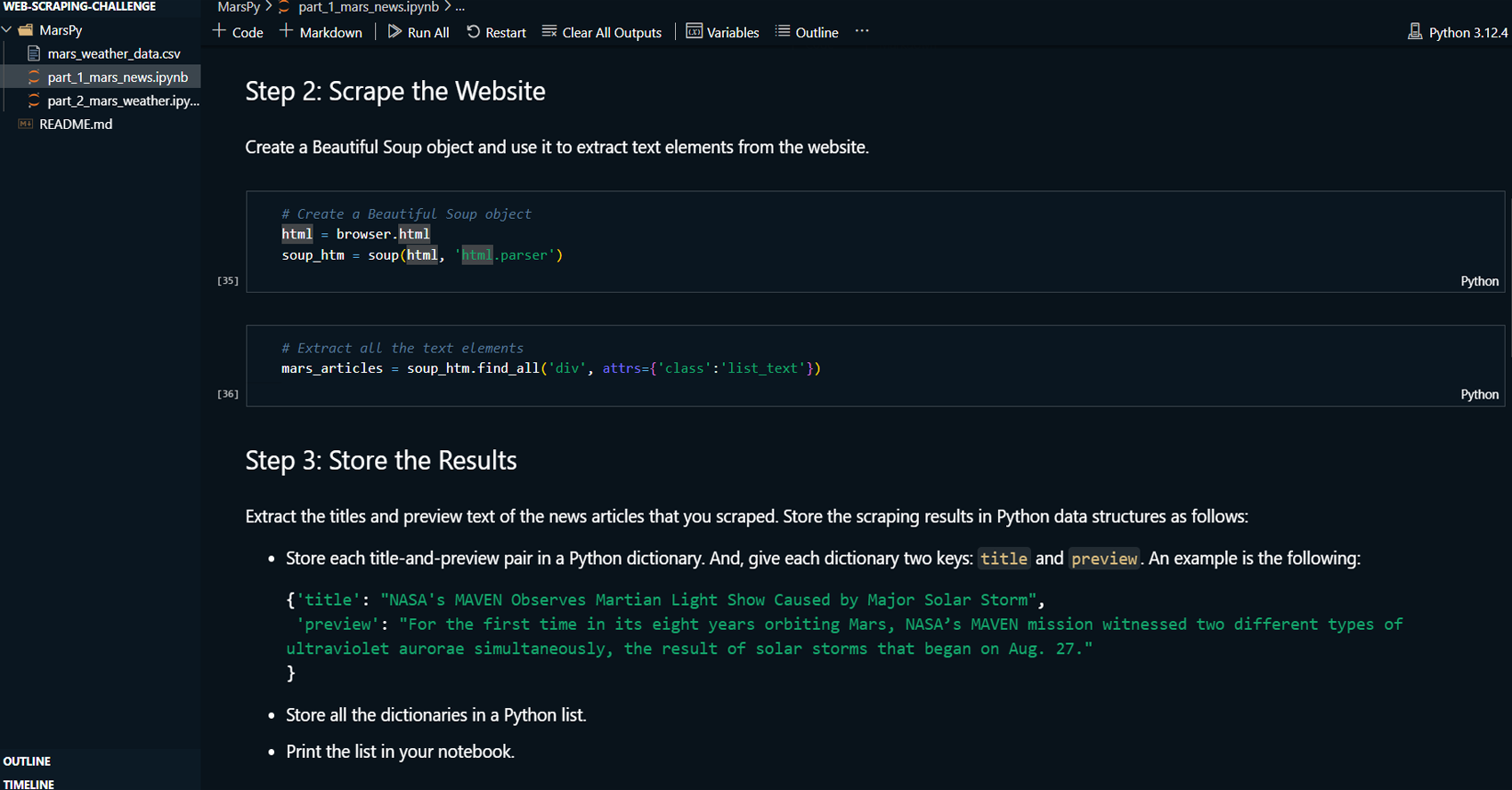 focuses on scraping titles and preview text from Mars news