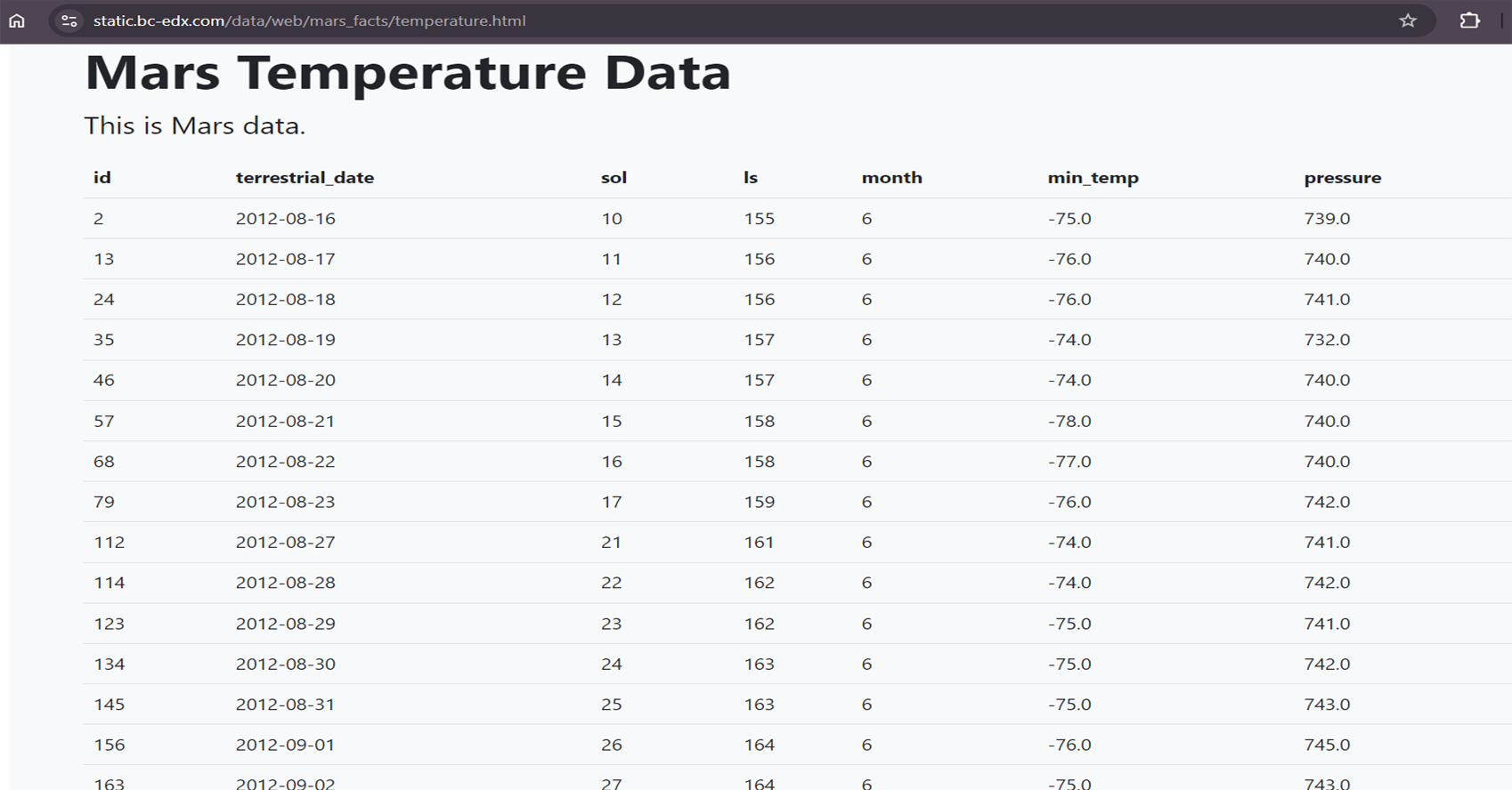 Mars weather data) from the HTML.