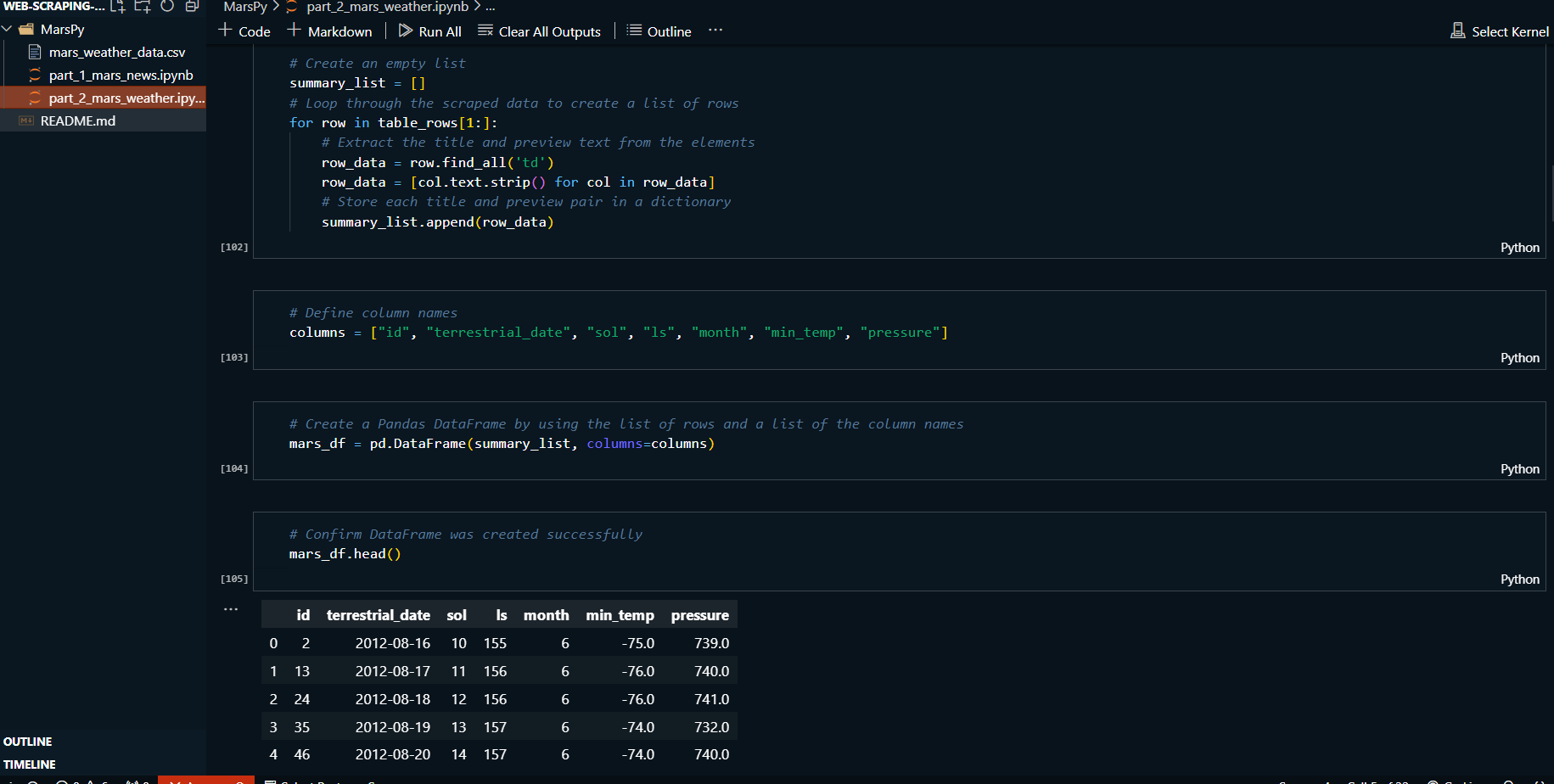 dictionaries for Mars news and into a Pandas