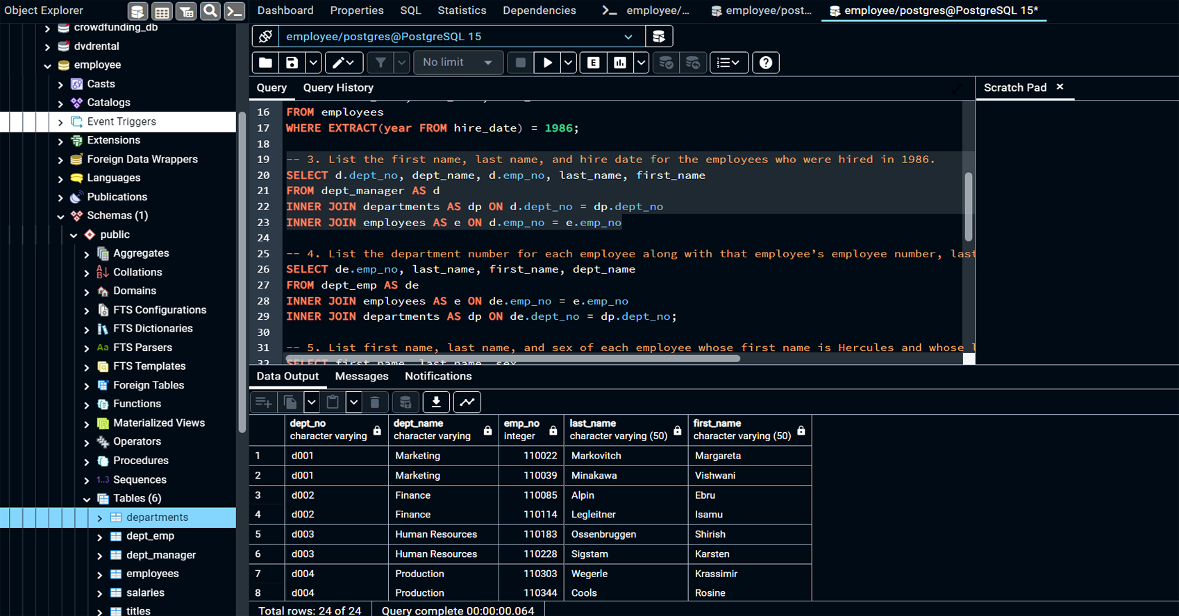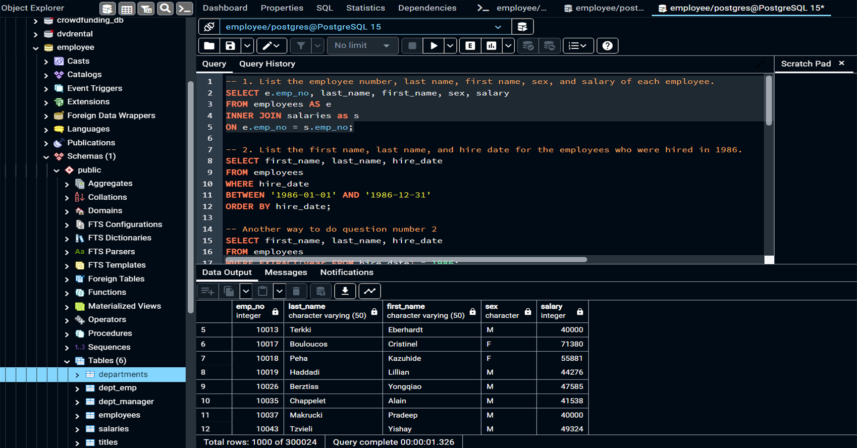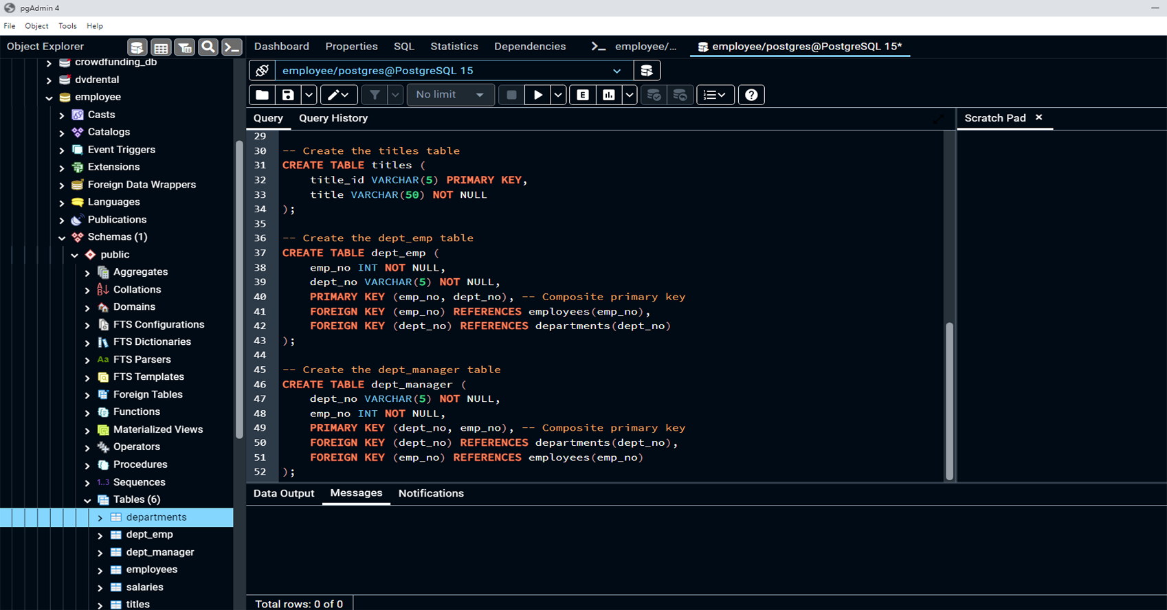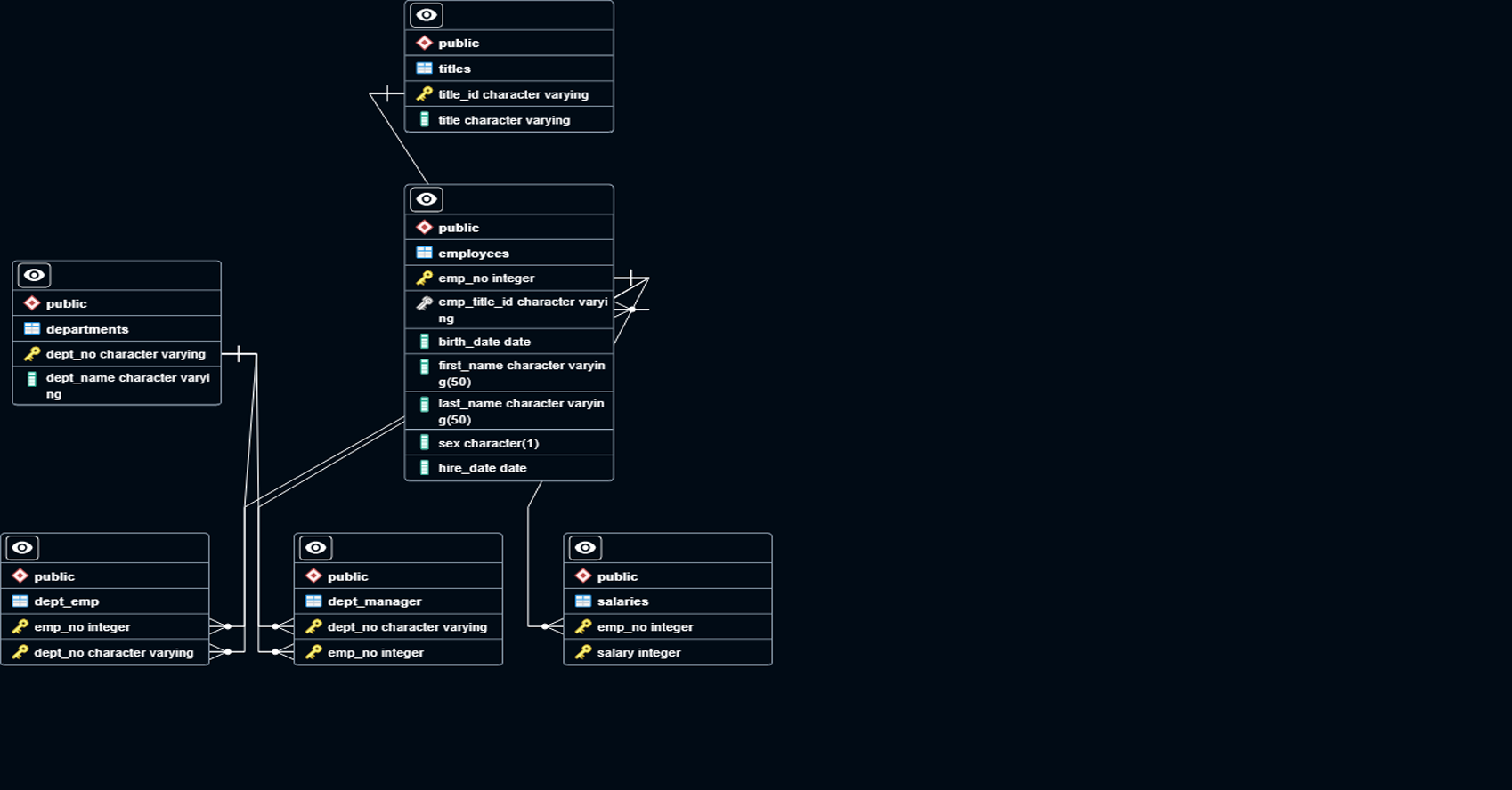 Created tables such as departments, employees, titles, salaries, dept_emp, and dept_manager in PostgreSQL, with well-defined columns and data types for each.