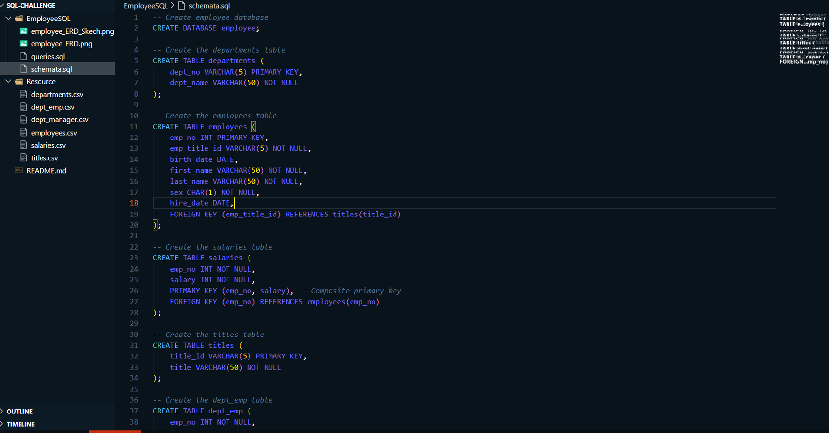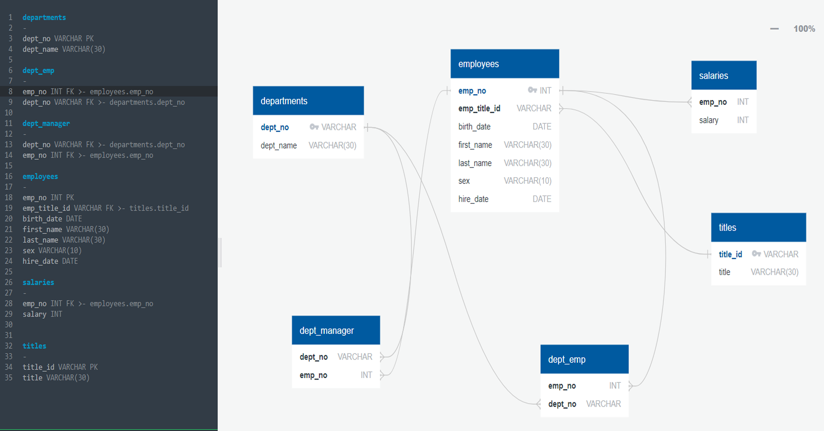 Created the initial Entity Relationship Diagram (ERD) using QuickDBD, which outlines the relationships between tables like employees, departments, titles, salaries, dept_emp, and dept_manager.