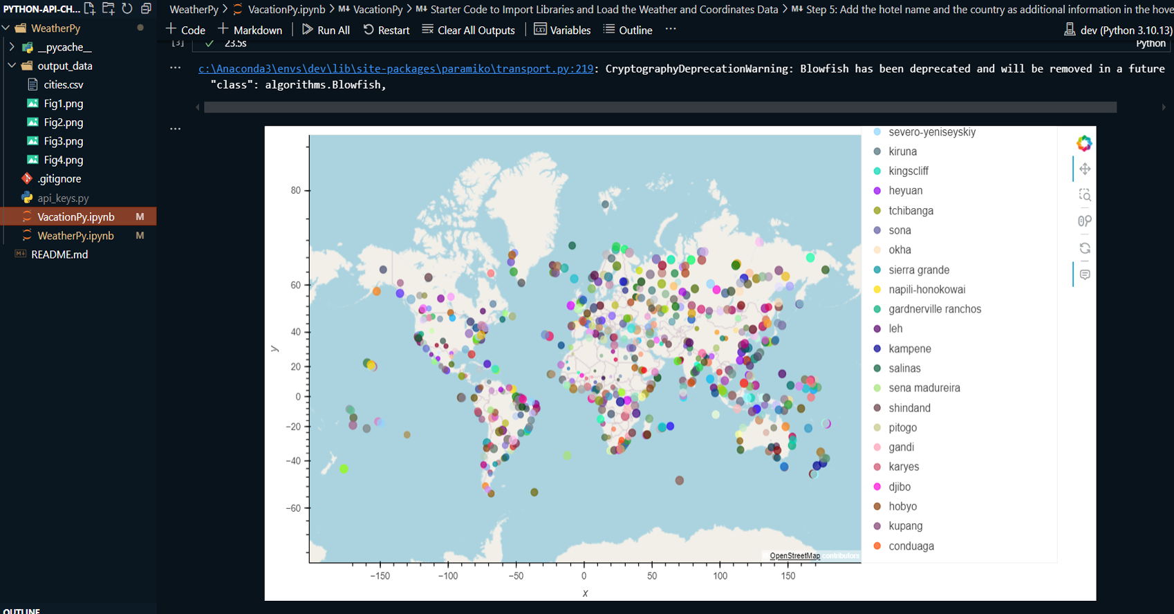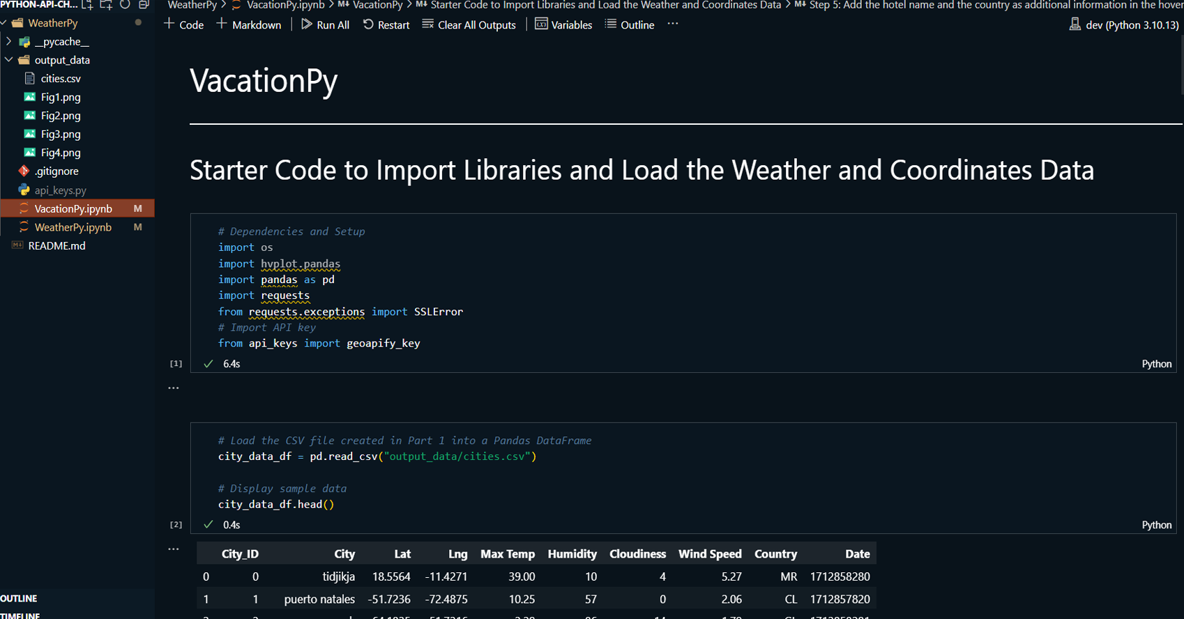 VacationPy: Utilizing weather data from WeatherPy, the project identifies ideal vacation destinations based on specific weather conditions, such as moderate temperature and low humidity. The Geoapify API is used to locate nearby hotels within a 10,000-meter radius of selected cities, and the results are plotted on an interactive map.