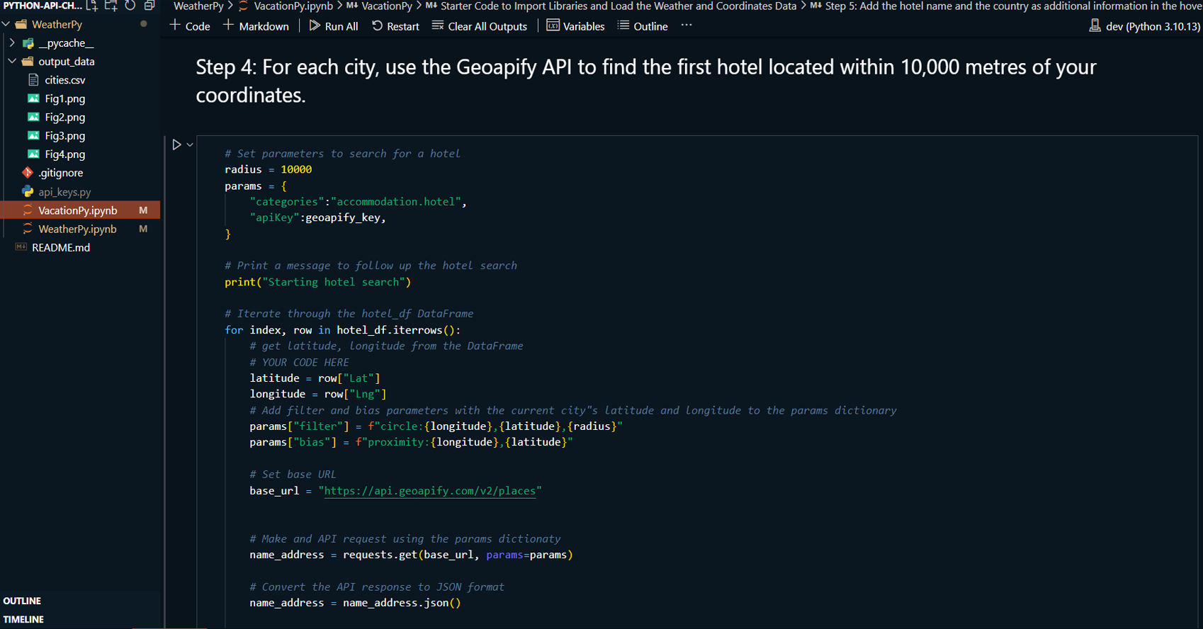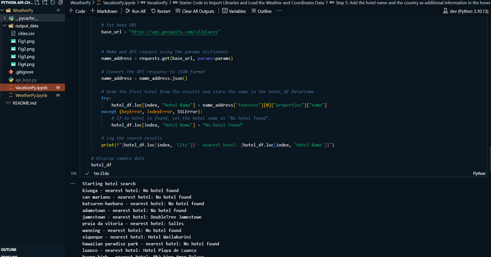 Retrieved hotel data for cities meeting the criteria using the Geoapify API and created a new DataFrame to store city, country, coordinates, and hotel data.
